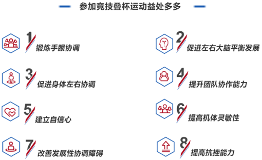 竞技叠杯运动是一种新兴的体育运动,对于青少年来说,竞技叠杯有助于锻炼学生的手眼协调能力,以及手部灵敏度和大脑反应速度,使双手灵巧迅速并且专注力大增。