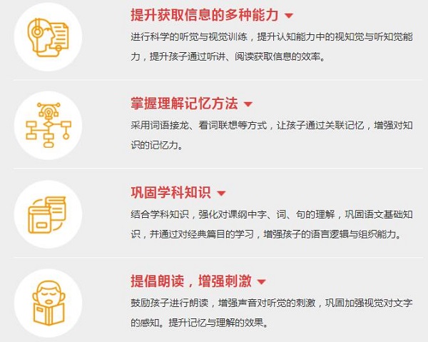 金色雨林阅读理解课由专业的阅读理解老师帮助学员首先进行科学有效的视觉和听觉能力的训练,提升学员的视觉能力和听觉能力,以此有效的提升学员通过听老师将和自己阅读有效的获取有用信息的效率;接着采用词语接龙,看词联想等科学有趣的方法,帮助孩子学会联想记忆,提升对知识的记忆能力;较后在结合学员的学科知识,强化字词句的认识和理解,加强语文基础知识,增强孩子的语言逻辑能力与表达能力。