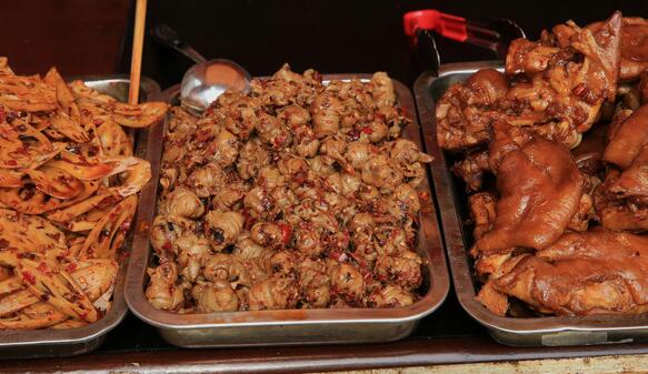 2.禽肉类:虎皮鸡蛋、五香鸡蛋、虎皮鸡爪、五香鸡爪、卤鸡腿、卤鸡翅、卤翅中、卤翅尖、卤鸡肝、卤鸡肫、卤鸭脖、卤鸭肠、卤鸭头、卤鸭胗等。