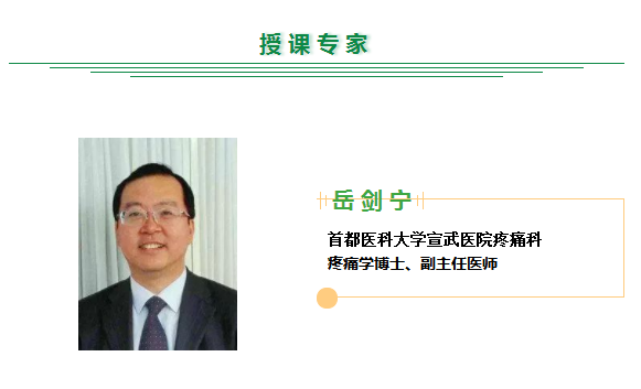 岳剑宁 世界疼痛医师协会中国分会委员,北京康复学会疼痛分会委员。中国临床医生杂志、中国全科医学杂志编委。有内科、神经内科、麻醉科、疼痛科多年三级甲等医院临床工作经历,上述学科间交叉内容的临床综合诊治能力及教学科研能力强。第一作者共发表论文二十余篇,主译著作一部。作为第二完成人获得省部级科技进步三等奖一项。个人主持完成院级及首医基临课题共四项。
