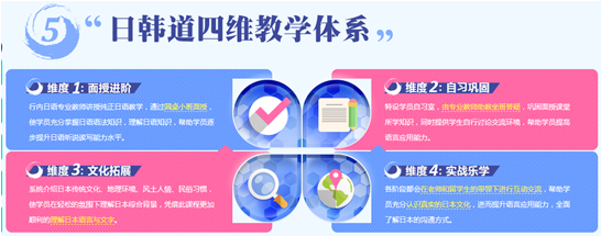 专业研发团队解读原版教材并进行筛选及研发,以保障学习效果。让学员在充分理解日韩语知识的状态下,逐步提升日韩听说读写能力水平。让学员体验日韩本土纯正的感觉,并完整领略日韩文化中语言魅力。