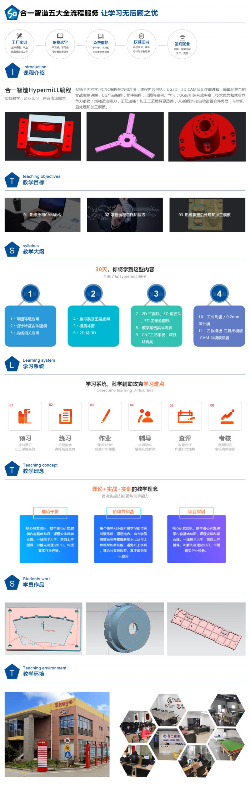 公司主营 CNC数控编程(3-4-5轴)定制培训业务,总结多年线下机加工企业内部培训经验,以NX.MasterCAM、PowerMill、 HyperMill 等软件为主导,以"CNC工艺系统”为特色(机床-刀具- 夹具-工件-CAM软件的组织协调能力),以“线上+线下”培训模式,结合当下主流工艺形式,高度还原实用本质。受到了自动化设备、功能性测试治(FCT/ICT)、 注塑模具、压铸模具、高压电导体、航空结构件加工领域企业的一致好评,真正做到行知合一,助力中国制造2025!