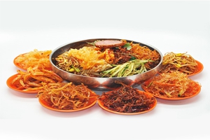 瓜丝金针磨、葱油海带丝、海带结、果仁菠菜、泡椒风爪