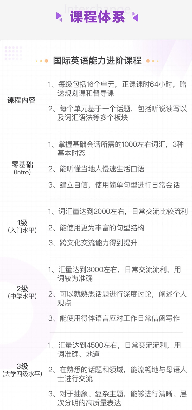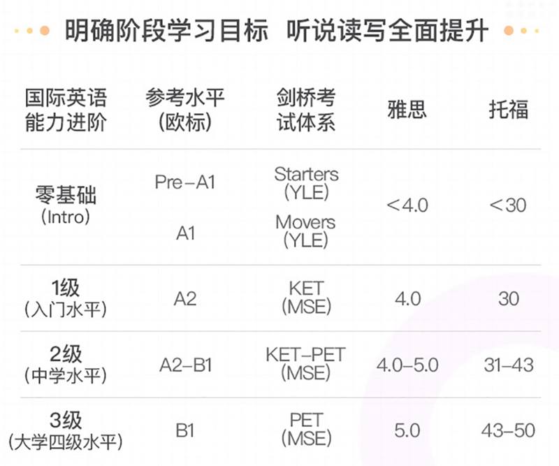 课程分为4个级别,每个级别的学习目标明确,均可以与欧标对应,循序渐进,特别适合零基础学员。
