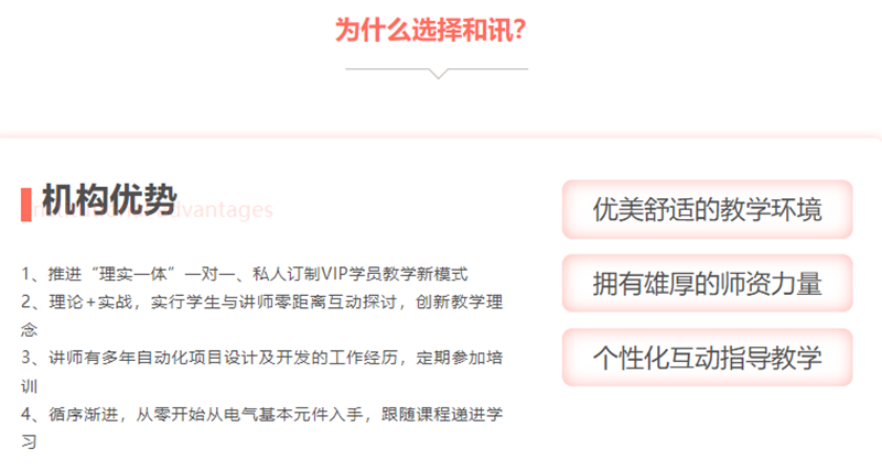 苏州和讯自动化培训中心是一家专业的自动化培训中心,隶属于和讯自动化设备有限公司,机构成立于2012年,提供电工培训、PLC培训、自动化设备设计及改造、工业自动化控制系统的设计及改造等服务。此外,机构汇聚了一批来自工控领域的专业技术人士和行业精英,他们在工控行业领域都有着平均5年以上大型项目开发经验,而且在培训方面均有着丰富的传授经验。这使得学员能够得到专业的指导和培训,更好地掌握自动化控制技能。