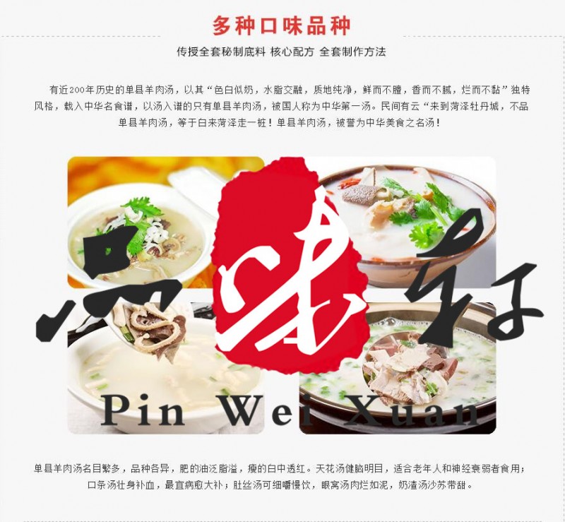 北京品味轩餐饮培训单县羊汤,最正宗、最标准的技术工艺。口味正宗,用料标准,适合初次开店创业者经营使用,操作简单、用工少、而且投资成本低,是没有经验,没有技术,没有学历的小本创业者开店创业的最佳选择!